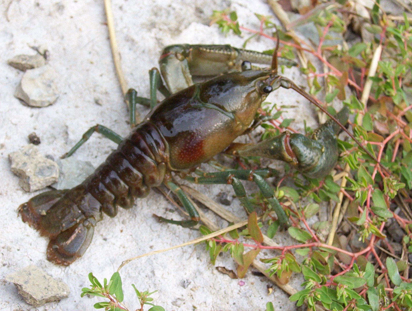 Nicknamed the rusty crayfish, Orconectes rusticus can be identified by the distinct rust-coloured spots on either side of its thorax. Photo credit: Premek Hamr